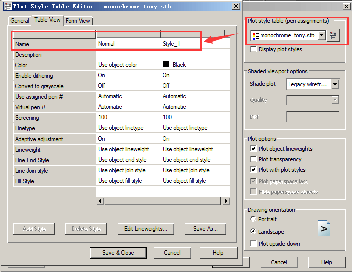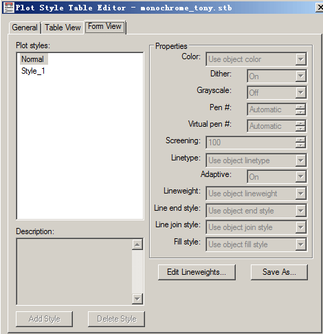 Open the print dialog box again, you will see the plot style table is displayed as STB. Click "edit" button to open the plot style editor. The Table View tab will be displayed by default. You can widen the dialog box to check the plot styles in STB as follows.