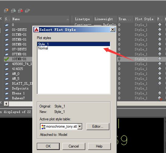 After switching to STB mode, open the Layer Manager, and click the plot style of the layer. A dialog box will appear where you can select the style, and set the plot style for the layer, as follows.
